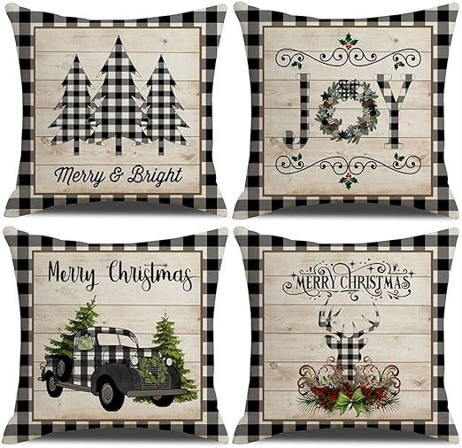 KACOPOL Christmas Buffalo Plaids Pillow Covers Christmas Tree Truck Farmhouse Decor Throw Pillow Case Cushion Cover 18″ X 18″ 4 Pack Christmas Decorations (Christmas Plaids & Joy)
